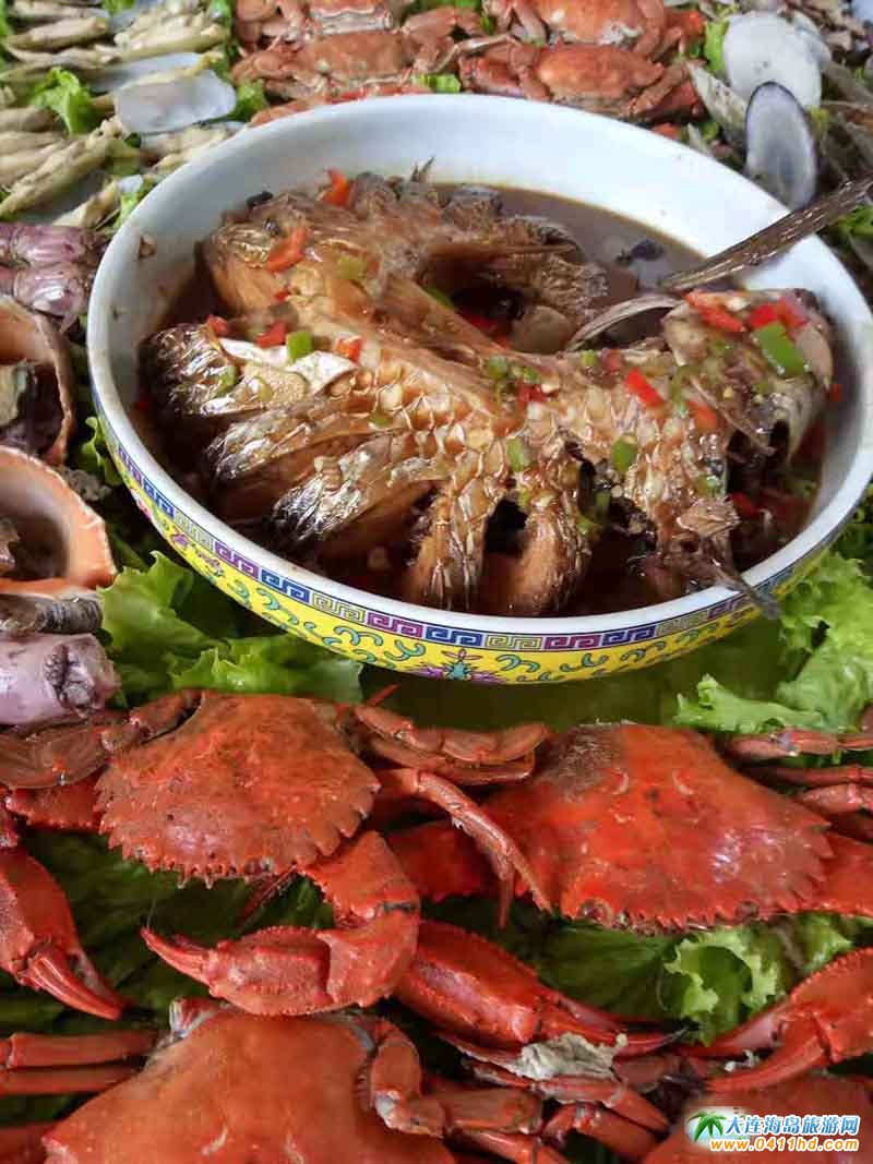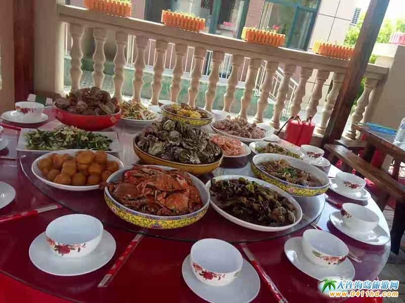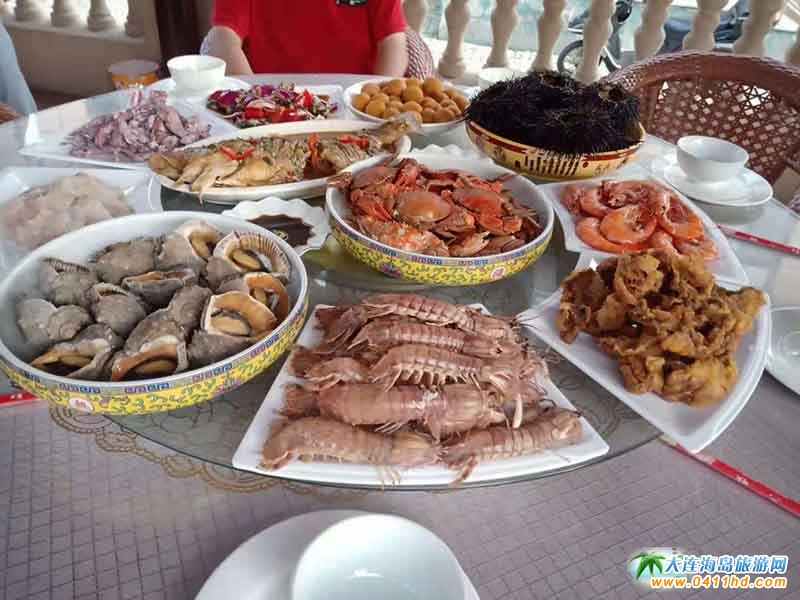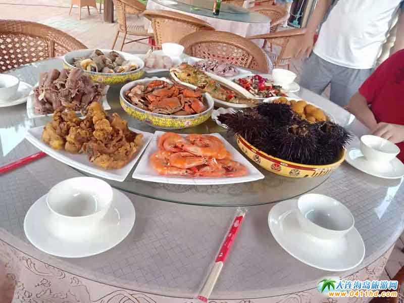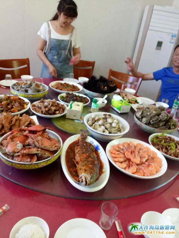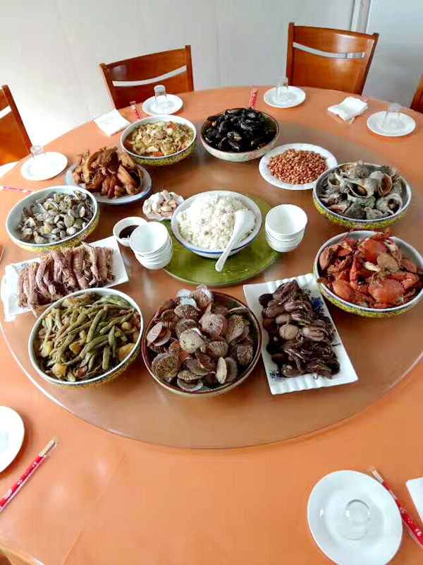 【早餐】 面包、牛奶、本地雞蛋、海邊鴨蛋、魚干兩種、小菜4道、饅頭、綠豆粥;【午餐】 煮鮑魚、煮飛蟹、煮海螺、煮扇貝、燉黑魚、清蒸老板魚、辣炒蜆子、炒烏魚花、煮莊河特產蛤叉、龍須拌蜆子、蕓豆排骨、炒本地雞蛋;【晚餐】涼拌海參、煮大蝦、煮蝦爬、蒜泥夏日貝、煮蟹甲紅、糖醋干燒魚、燉黃魚、煮銀耳鮮、煮蠣黃、炸黃花魚、燉莊河大骨雞、燉殺豬酸菜(排骨、肘肉)