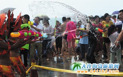 親水、戲水、潑水活動是本屆大連國際沙灘文化節的重頭戲。8月9日上午,隨著黃金海岸噴泉廣場上音樂聲響起,黃金海岸變身為清涼的海底世界,派對開始后,一場色彩繽紛的水車巡游在黃金海岸清涼上演,兩輛噴水彩車可以噴灑出高達5米的清涼的水霧,將周圍的人都帶入水的世界。美麗的人魚公主、調皮的海底精靈、邪惡的加勒比海盜……來自各地認識的不認識的萬名游客加入這樣一場狂歡的慶典和瘋狂的水戰之中,還有游客干脆挽起褲腳,在角落里玩起了躲貓貓,專門制造“槍林彈雨”偷襲別人。