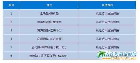 為了確保廣大群眾出行安全、提高通行效率,大連市公安局開發區分局交通警察大隊定于2019年12月2日起,在下列地點啟用電子警察對不禮讓行人、單行道違法等行為進行抓拍。
