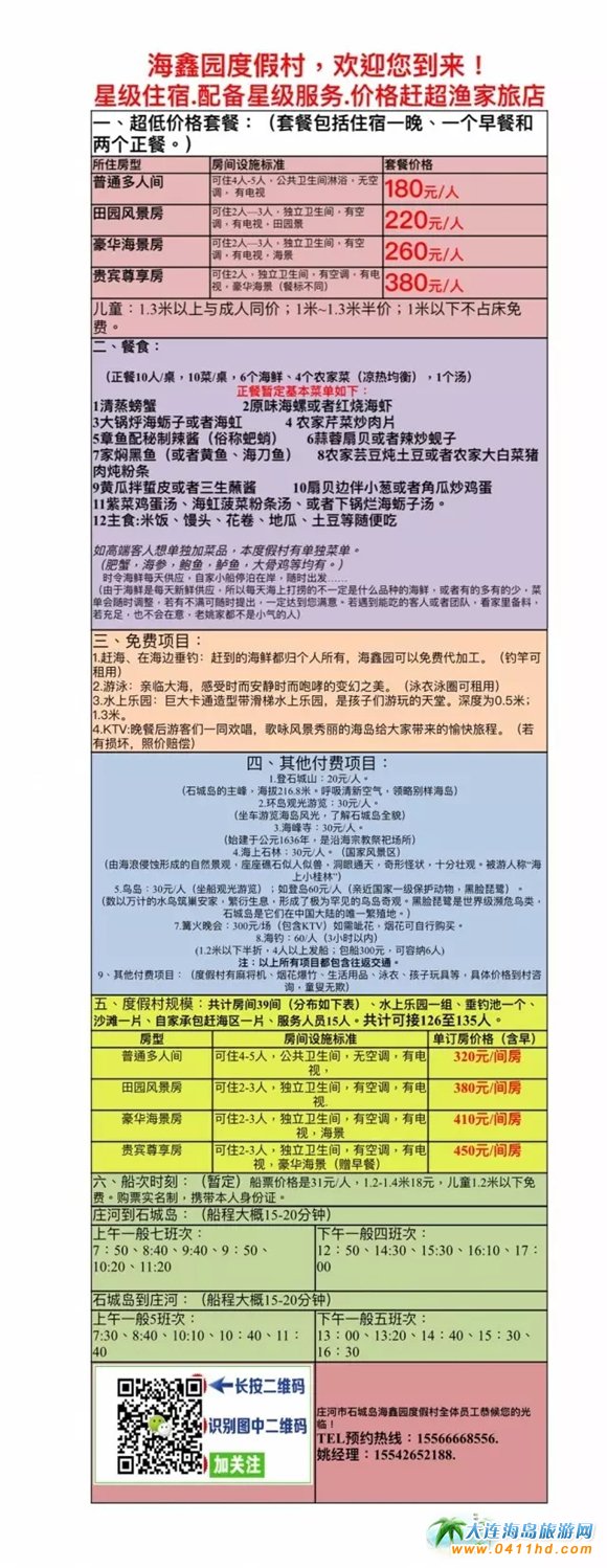 如果您對海鮮情有獨鐘,選擇海鑫園不會錯!用餐和飲用水全部取自島上自然產出。綠色的蔬菜、無激素家禽、自產的海鮮,讓您吃的放心!遠離城市的喧囂,走進農家小院,品嘗土色土香的農家菜吧~