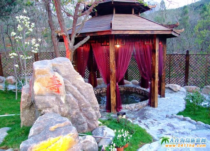 旅順香格里湯泉宮室外溫泉景觀山石和紅綠相間的樹木,人工雕琢與自然風物渾然一體,山澗溪水與溫泉泡池錯落有序;異形室外浴,木質茶樓與溫泉會館,水療中心交相輝映。