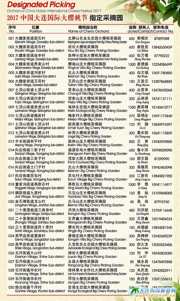 另據了解,2017大連國際大櫻桃節,將通過加大旅游與文化、旅游與產業、旅游與自貿的融合,做火旅游采摘營銷市場,實現組織包機30架、東北列車100節、省內大巴300臺、旅游團隊7000個、自駕車15萬臺,帶動果農增收的目標。