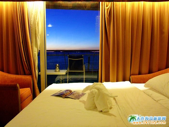海洋神話號郵輪豪華套房面積約44㎡,配備有可以并和成雙人床的兩只單人床,并且配有可展開作為床鋪的長條沙發,最多可容納3人(或2大人2兒童)入住,海景套房最大亮點是房間的位置以及露天觀景陽臺,位置都在郵輪的第八層,在船尾的位置,不同于普通房間在船艙的兩側,因此觀景角度視覺非常突出。房間內配有私人浴室,冰箱,化妝臺,電吹風,電視機,電話,110V-220V的電源,保險柜,躺在床上,既可以透過落地玻璃窗觀賞到外面的海景。