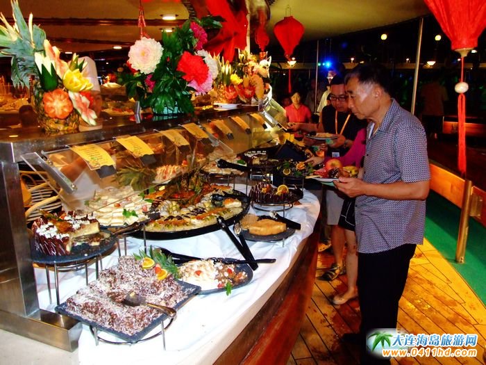 "郵輪上的午夜派對上,一頓豐盛的大餐不僅滿足了您的胃,更是愉悅了您的眼睛。完美的