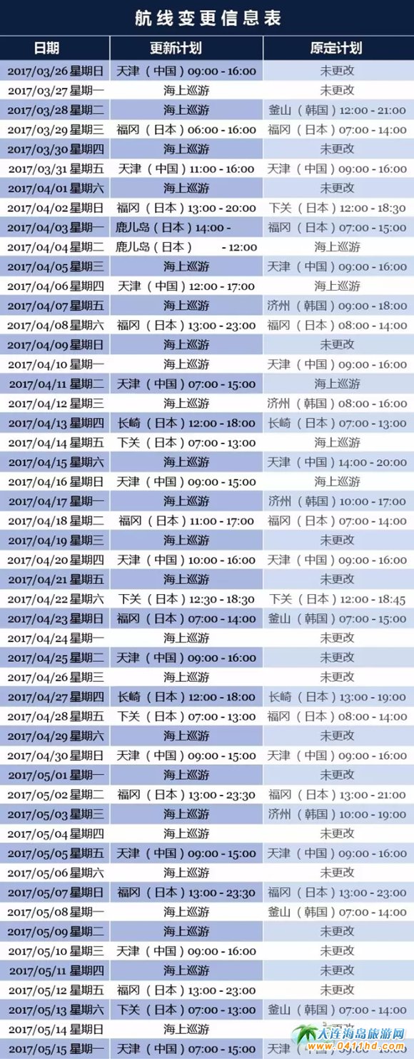 鑒于近期韓國局勢的發(fā)展,MSC地中海郵輪公司對旗下“抒情號”郵輪自2017年3月26日至5月15日期間的航次行程進(jìn)行了調(diào)整,取消韓國港口的?,調(diào)整部分日本港口的靠泊時間。此外,MSC地中海郵輪將通過增加更多的船上娛樂休閑活動安排,提升整體體驗,為乘客提供更加舒適悠閑的歐式海上假期。